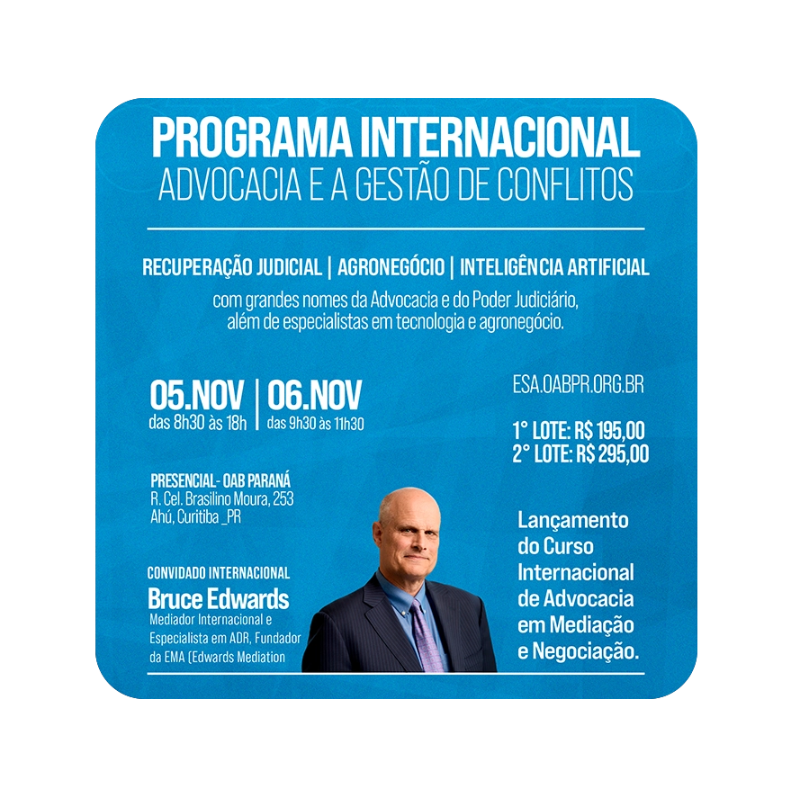 Debateremos temas essenciais como Recuperação Judicial no Agronegócio e o uso de Inteligência Artificial, ao lado de grandes nomes da advocacia e do Poder Judiciário. Será uma oportunidade única de aprendizado e networking, marcando também o lançamento oficial do Curso Internacional de Advocacia em Mediação e Negociação! Uma oportunidade única de desenvolvimento profissional que confere Certificação Internacional: