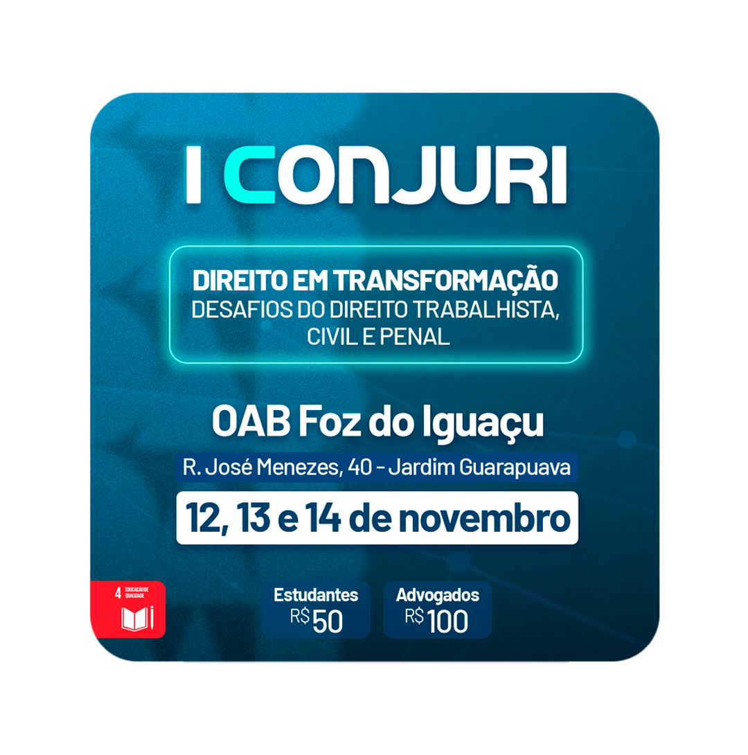 Em sua primeira edição, o I CONJURI Foz do Iguaçu propõe um espaço de diálogo e aprendizado,promovendo debates sobre temas jurídicos contemporâneos e os desafios do Direito nas áreas cível, penal e trabalhista. A programação inclui sessões matutinas com apresentações de Resumos por acadêmicos e profissionais do Direito e, no período noturno, palestras ministradas por profissionais de destaque, garantindo uma imersão completa e enriquecedora.