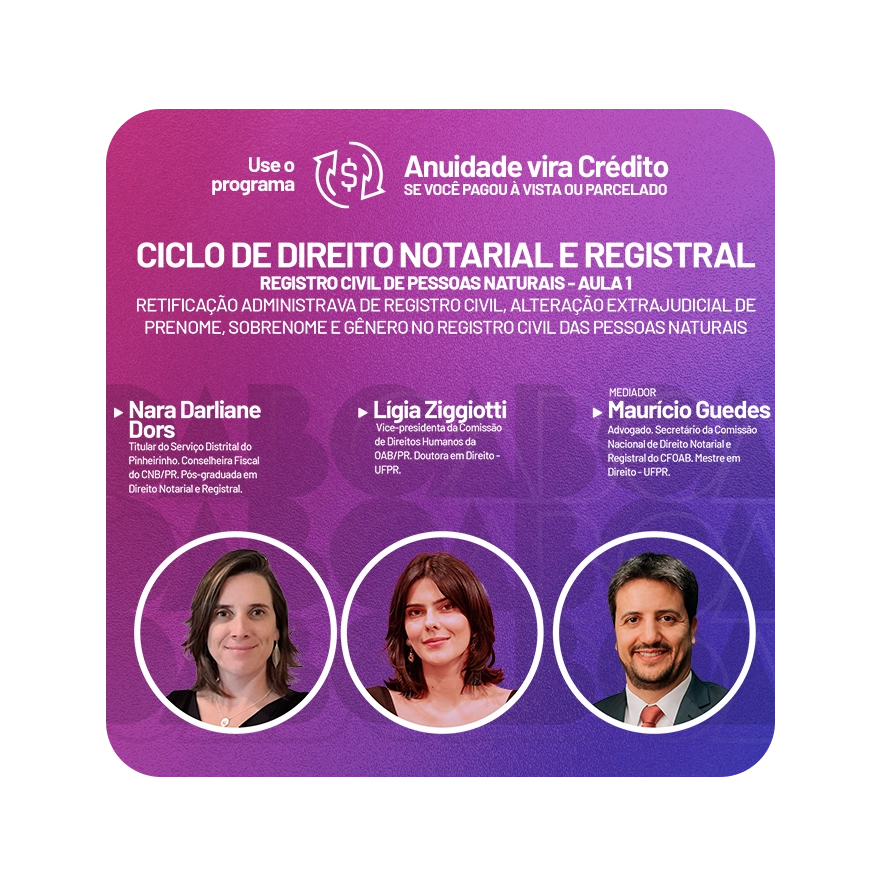 Para se inscrever na modalidade online, acesse: https://esa.oabpr.org.br/home/course/5663-ciclo-de-direito-notarial-e-registral-aula-1/1453