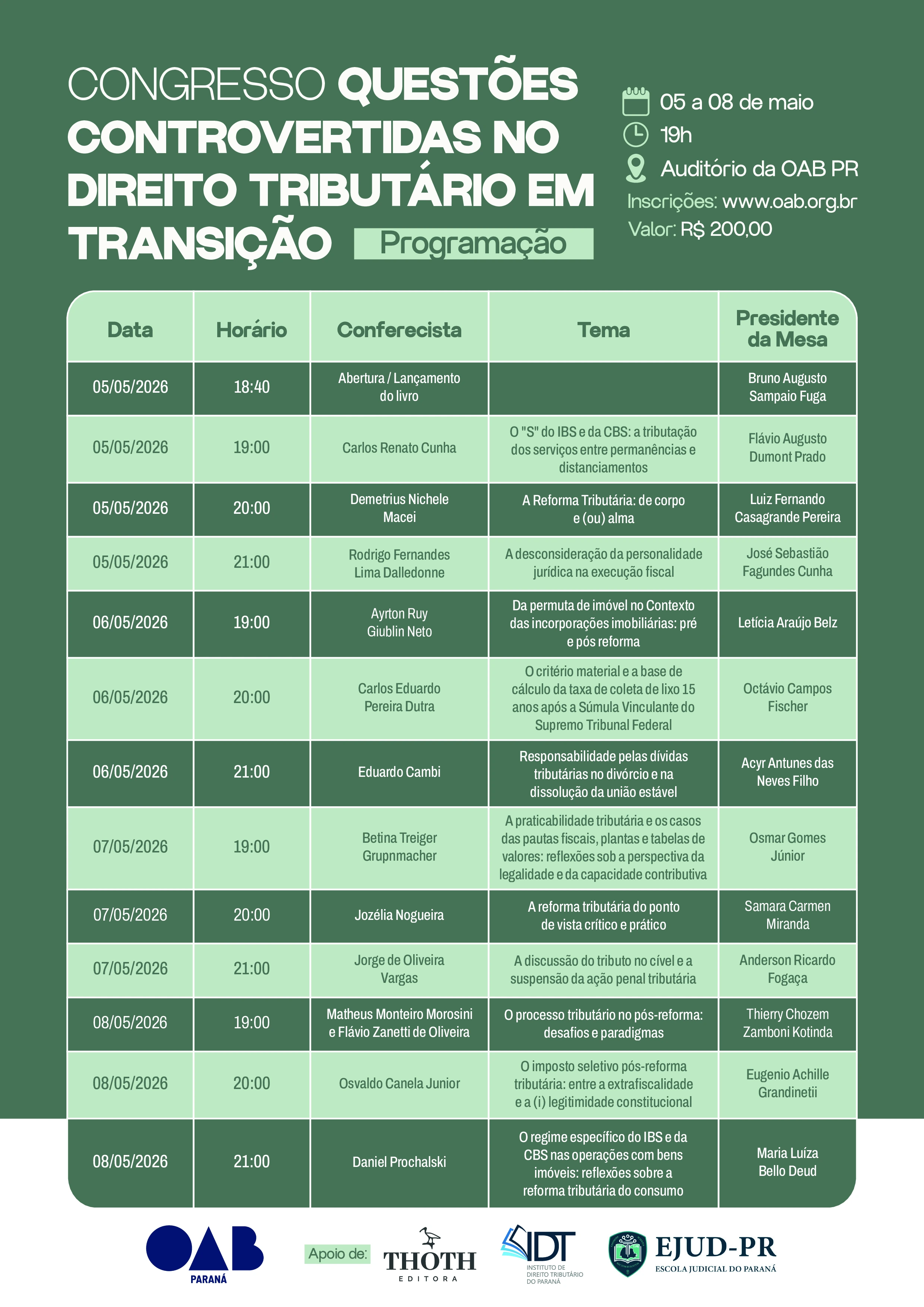 Apoio: Thoth Editora, IDT (Instituto de Direito Tributário do Paraná) e EJUD-PR.